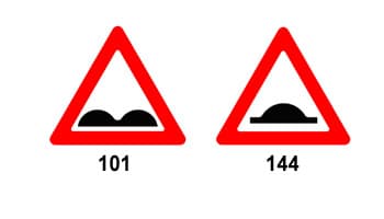 איך לזכור: שני התמרורים הם תמרורי אזהרה (משולשים). אחד מזהיר מקטע כביש משובש (101) והשני מפס האטה בודד (144). מה הפעולה המשותפת וההגיונית שכל נהג צריך לעשות כשרואה כל אחד מהם?